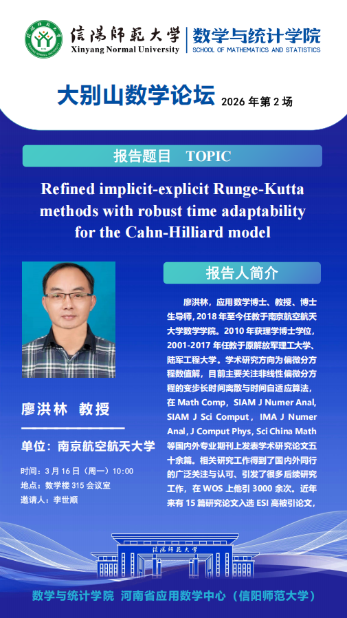 大别山数学论坛:南京航空航天大学廖洪林教授——Refined implicit-explicit Runge-Kutta methods with robust time adaptability for the Cahn-Hilliard model
